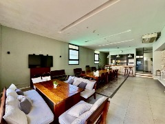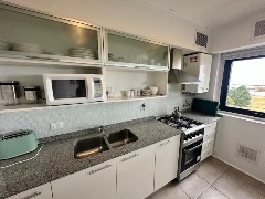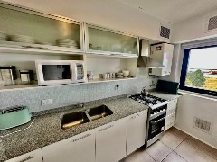 * Cocina integrada con barra desayunadora, anafe y horno, heladera con freezer, alacenas y buena superficie de trabajo.