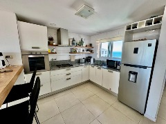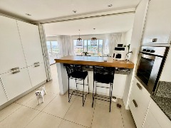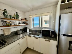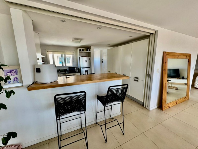 Cocina integrada con barra desayunadora, moderna y funcional, con acceso independiente gracias a la doble entrada.