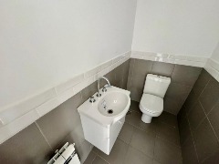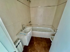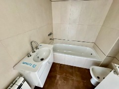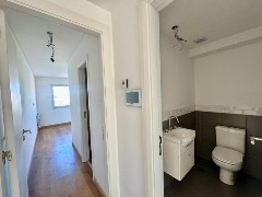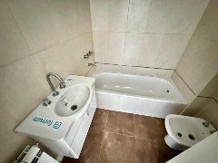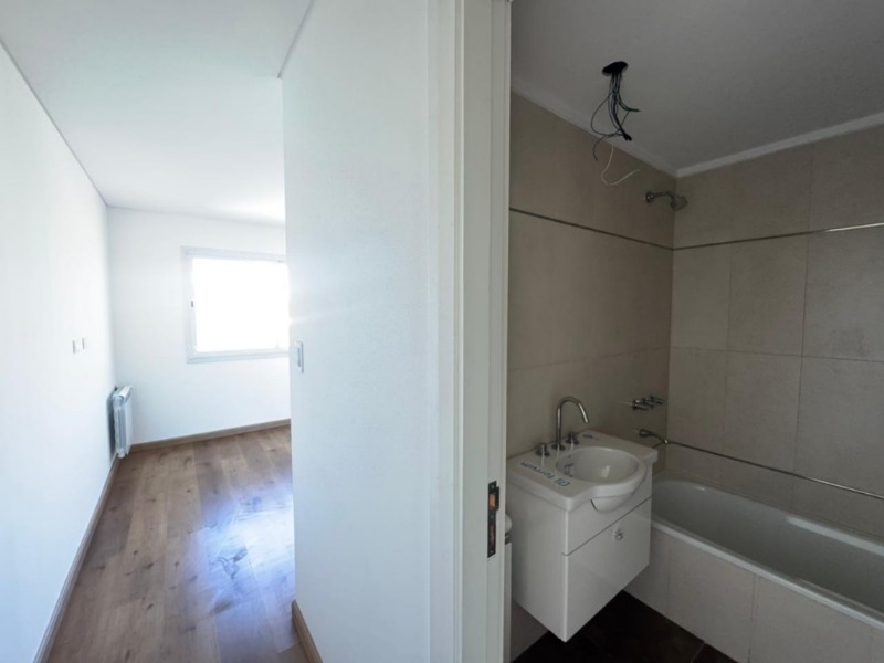 El baño en suite, completamente revestido en cerámicos, se encuentra equipado con bañera, sanitarios marca Roca, griferías FB y vanitory suspendido, logrando un espacio moderno y funcional con muy buenas terminaciones.