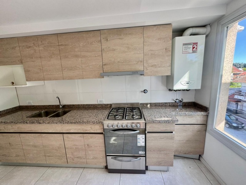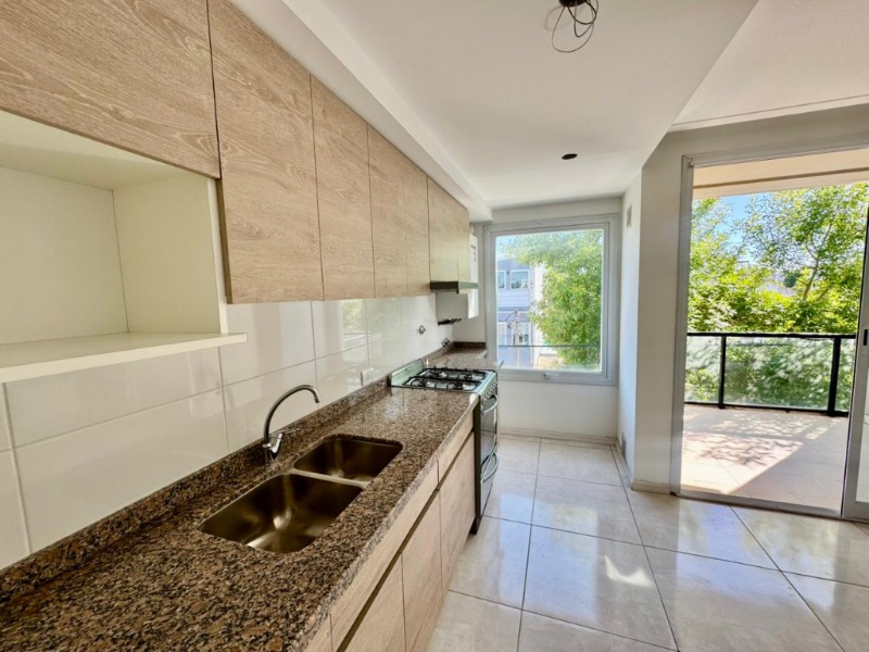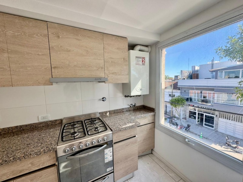 La cocina se presenta de manera lineal, equipada con muebles bajo mesada y alacenas en tonos madera, mesada de granito, cocina y horno marca Domec, campana extractora y espacio previsto para electrodomésticos. Un ventanal lateral aporta luz natural directa al área de trabajo.